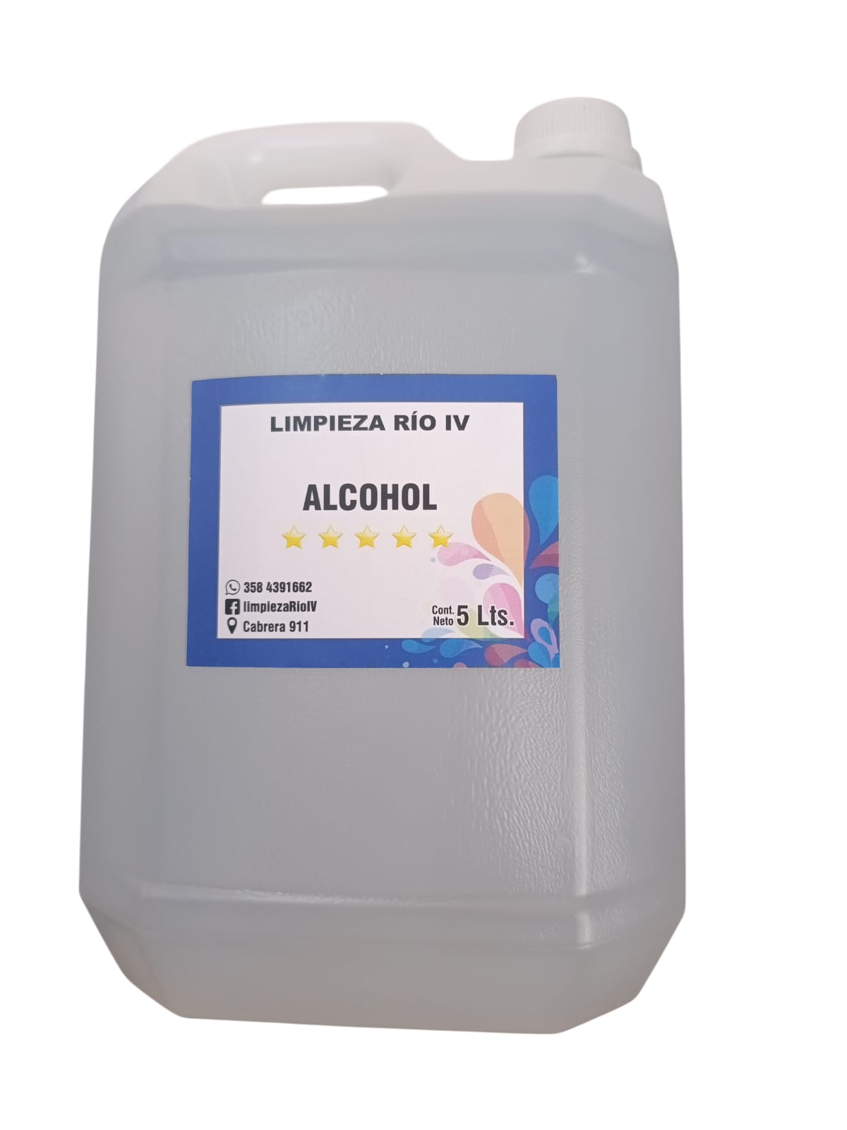 Alcohol líquido por 5 litros, ideal para limpieza y desinfección de superficies. Uso doméstico, comercial e institucional. Alto rendimiento.