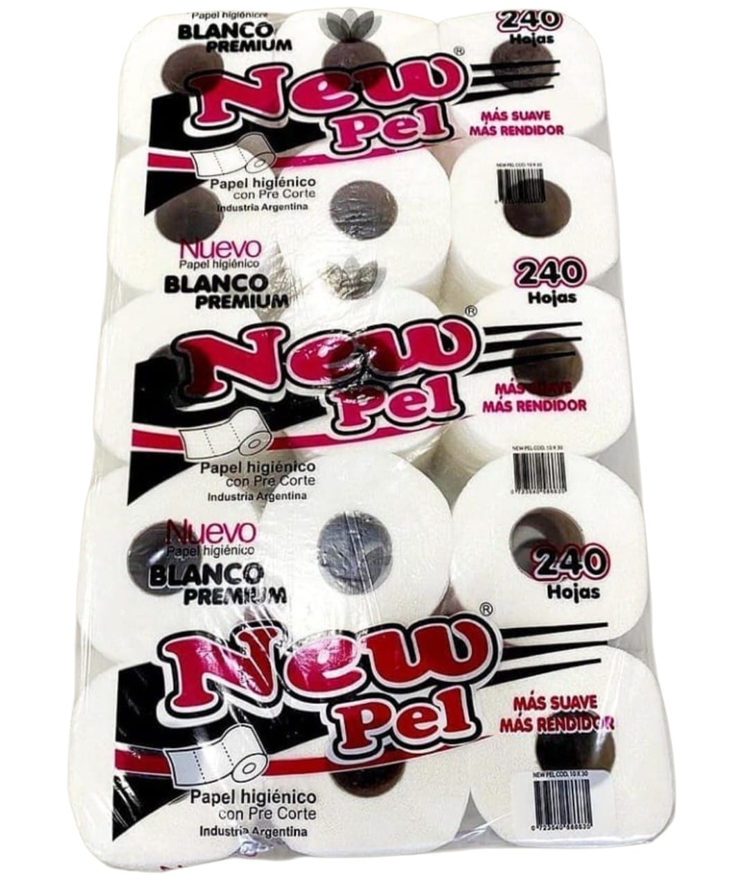 Bolson de papel higiénico NEWPEL Blanco Premium x 30 rollos. Suaves, resistentes y rendidores, con 240 hojas por rollo y sistema de precorte para un uso práctico y económico.
