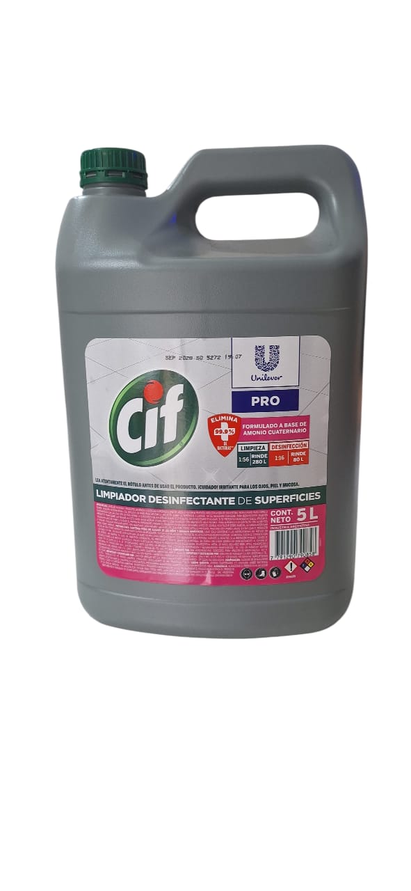 Limpiador desinfectante de superficies Cif Pro 5L, formulado a base de amonio cuaternario. Ideal para limpieza e higiene profunda en hogares, comercios, oficinas y espacios de alto tránsito.