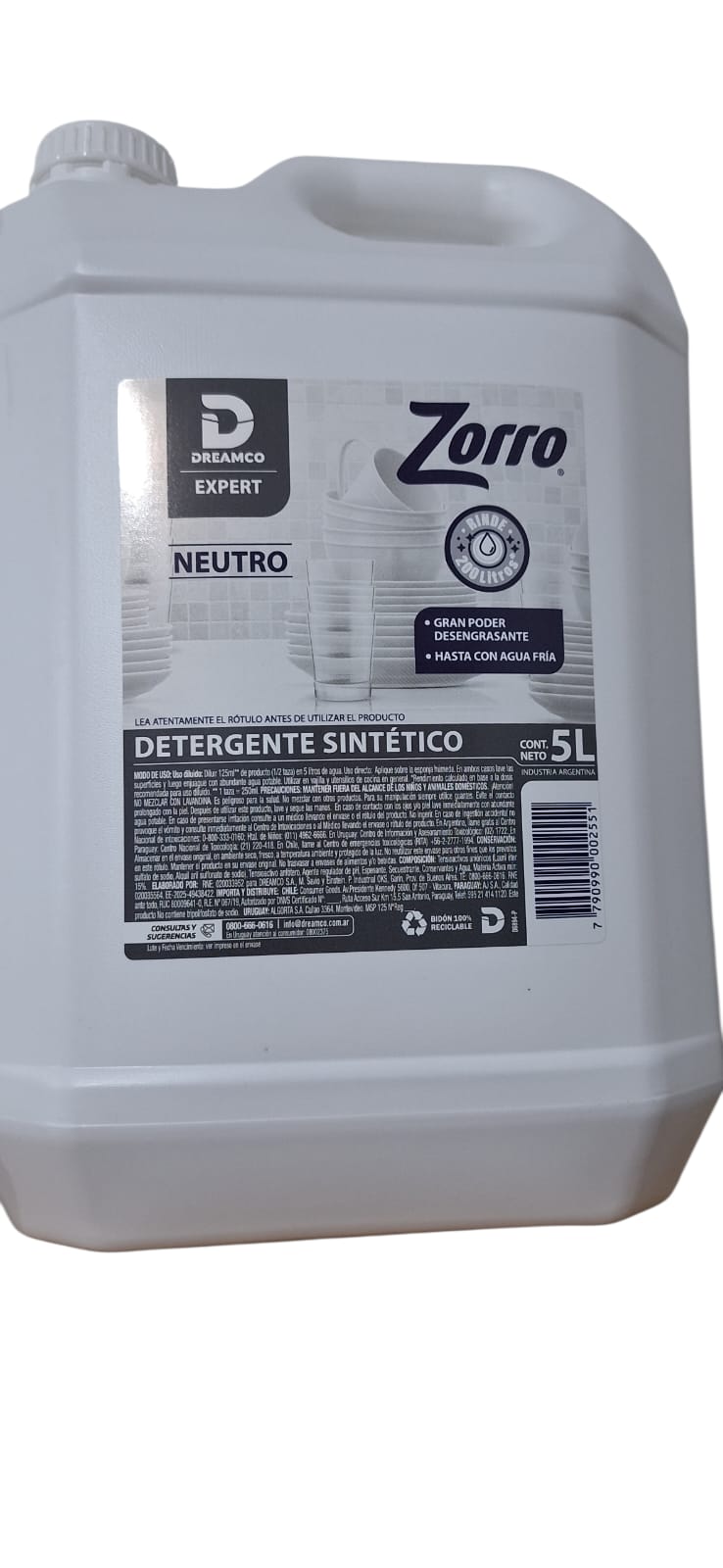 Detergente Sintético Neutro Zorro en bidón de 5 litros, con gran poder desengrasante incluso en agua fría. Ideal para vajilla y limpieza general, cuida las manos y rinde más.