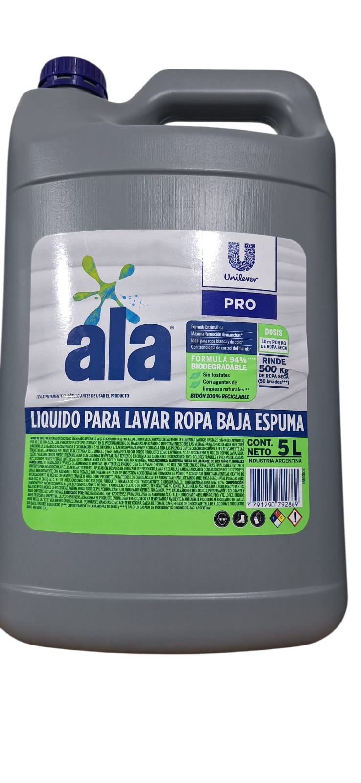 Detergente líquido ALA Pro Baja Espuma en bidón de 5 litros, ideal para lavado profesional y doméstico. Máxima remoción de manchas, alto rendimiento y fórmula biodegradable, apto para ropa blanca y de color.