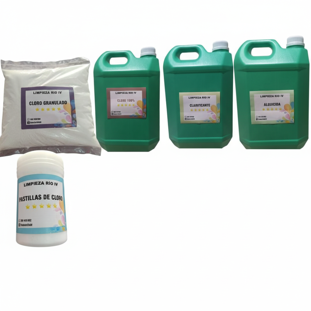 Promo Piletas completa para el mantenimiento del agua. Incluye cloro líquido, alguicida, clarificante, cloro granulado y pastillas triple acción. Ideal para mantener tu pileta limpia, cristalina y desinfectada.